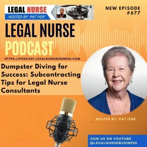 Welcome to the Legal Nurse Podcast, hosted by Pat Iyer. In today’s episode, “677 Subcontracting Tips,” Pat Iyer explores the unpredictable, challenging, but highly rewarding world of subcontracting as a legal nurse consultant. She kicks things off with a memorable true story. Imagine having to enter a dumpster to rescue the only set of vital…
